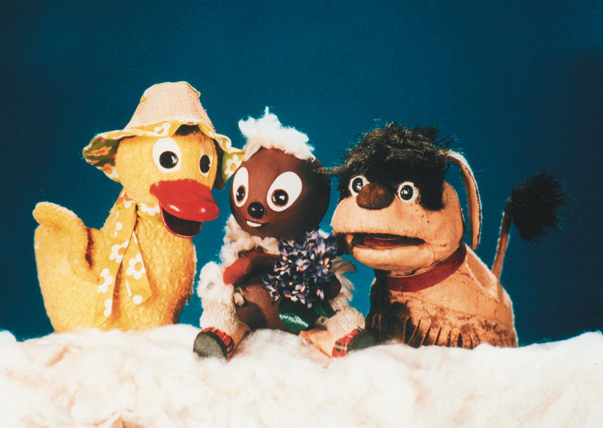 In einer bunten Aufführung sitzen eine gelbe Ente, Pittiplatsch und Moppi zusammen auf einer Schneelandschaft und interagieren spielerisch miteinander.