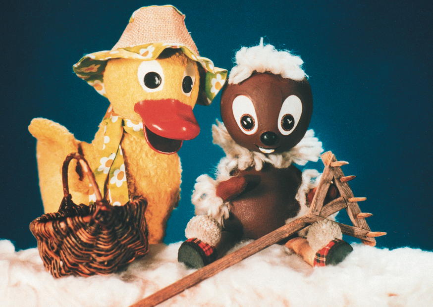 Das Entchen trägt einen Sonnenhut und einen Korb, während Pittiplatsch mit einem Rechen spielt und fröhlich wirkt. Die beiden Charaktere wirken freundlich und einladend.