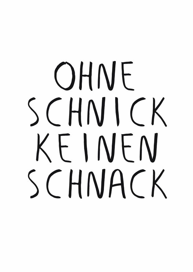 Das Poster zeigt in klarer Schrift den Spruch Ohne Schnick keinen Schnack und bietet eine stilvolle Wanddekoration in einem modernen Raum.