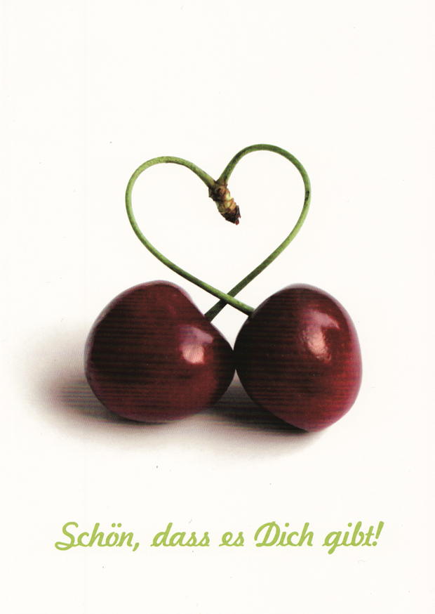 Zwei rote Kirschen stehen eng zusammen und bilden mit ihren grünen Stielen ein Herz. Die Botschaft feiert die Freude über das Leben und Beziehungen.