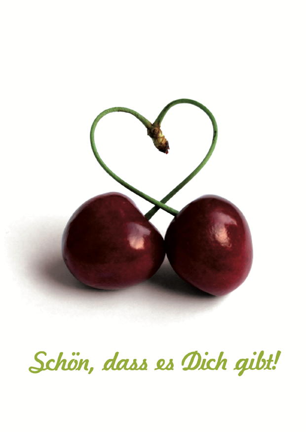 Zwei rote Kirschen sind kreativ angeordnet und bilden ein Herz mit einem grünen Stängel, während eine liebevolle Botschaft darunter steht. Ein schöner Anblick, der Freude ausstrahlt.