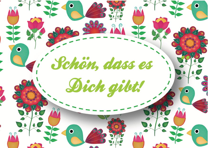 Auf einem farbenfrohen Hintergrund aus Blumen und Vögeln steht in der Mitte der Text Schön, dass es Dich gibt. Perfekt für besondere Anlässe und persönliche Botschaften.