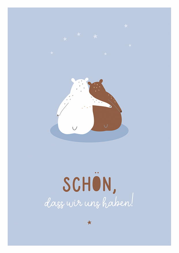 Zwei Bären, einer weiß und der andere braun, umarmen sich sanft vor einem blauen Hintergrund, um ihre enge Bindung und Freundschaft auszudrücken.