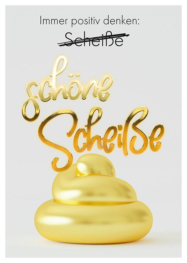 Eine goldene Skulptur, die eine positive Botschaft vermittelt und humorvoll mit einer ursprünglich negativen Aussage spielt. Der Kontrast spricht für Optimismus.