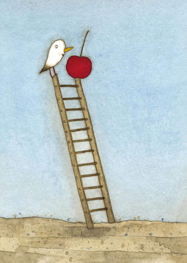 Ein kleiner Vogel steht auf einer Leiter und versucht, eine rote Kirsche zu erreichen. Die Szene spielt in einer ruhigen Umgebung am Tag, umgeben von sanften Farben.