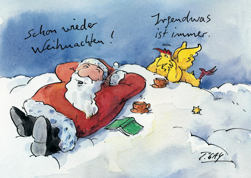 Der Weihnachtsmann liegt entspannt auf einer Wolke, genießt eine Tasse Tee und plaudert mit einem gelben Huhn. Es ist wieder Weihnachten und gute Laune herrscht.