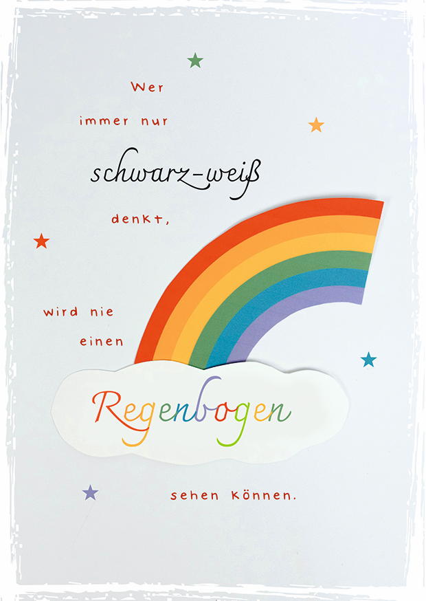 Eine kreative Anordnung mit einem Regenbogen und einem erhebenden Zitat zeigt die Bedeutung der positiven Denkweise und der Farbenvielfalt im Leben.