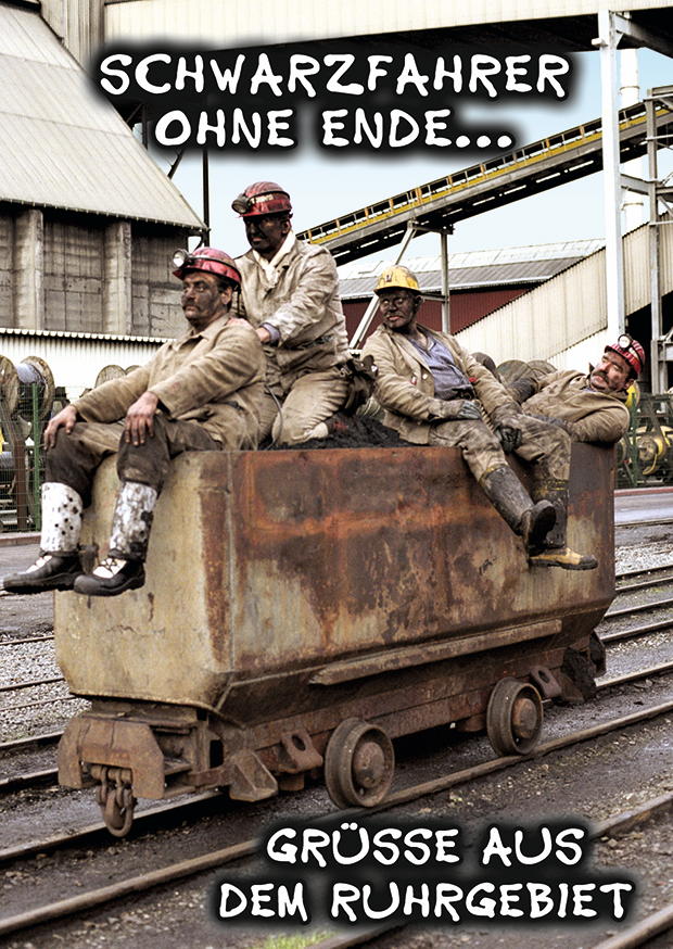 Bergleute entspannen auf einer Loren während ihrer Arbeitspause in einer alten Kohlenmine im Ruhrgebiet, umgeben von industrieller Architektur und Maschinen.
