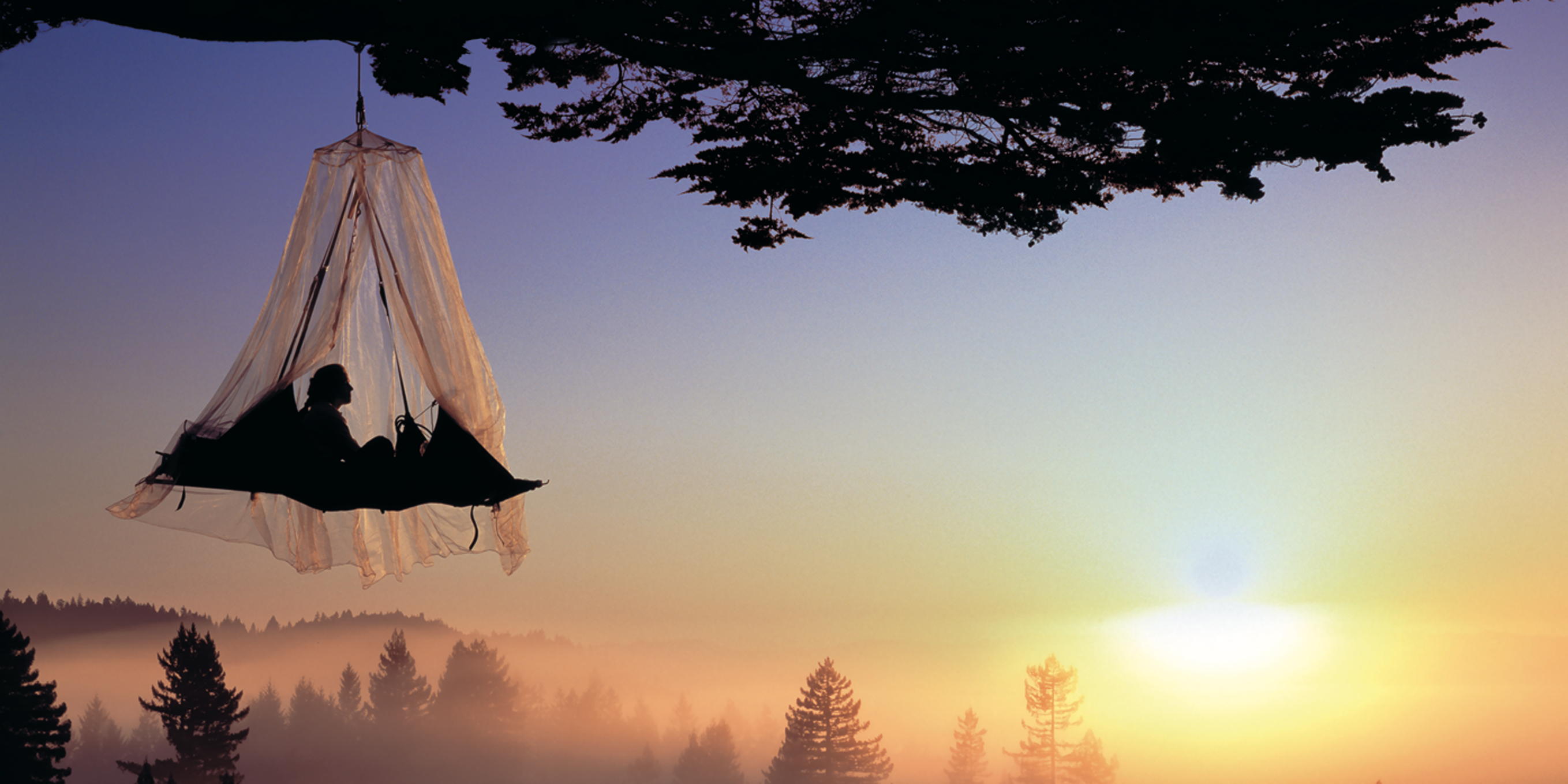 Eine Person sitzt entspannt in einer transparenten Hängematte, während die Sonne aufgeht und die Landschaft in sanftem Nebel gehüllt ist. Die Umgebung strahlt Ruhe und Frieden aus.