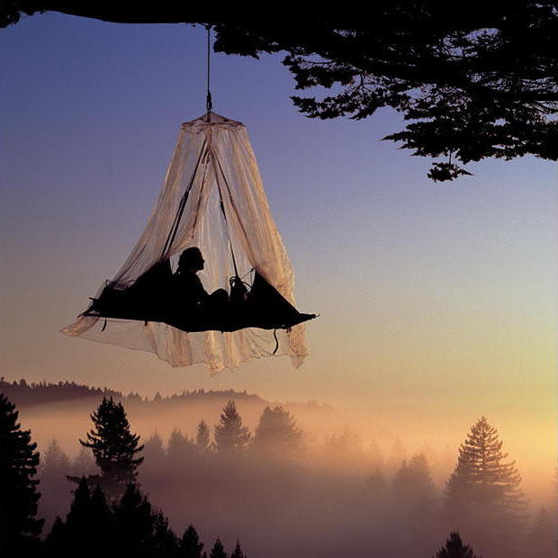 Eine Person entspannt in einer schwebenden Hängematte, umgeben von dichten Bäumen und einem sanften Nebel, während die Sonne untergeht.
