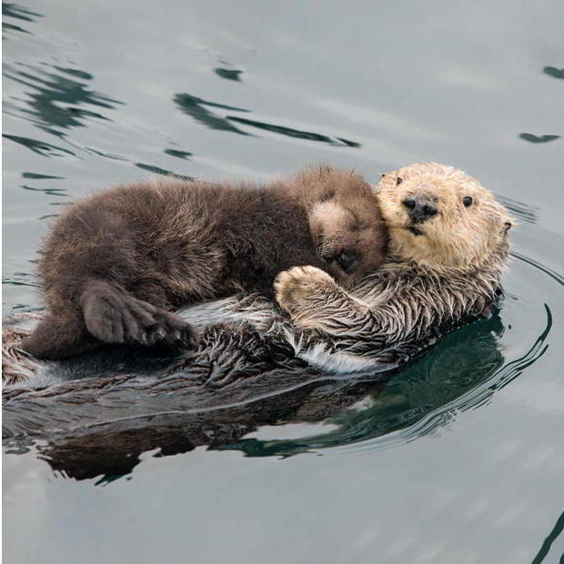 Eine Mutterseeotter kuschelt mit ihrem Jungen im Wasser. Sie schwimmen in einer ruhigen Bucht und genießen die gemeinsame Zeit. Der Tag ist sanft und friedlich.