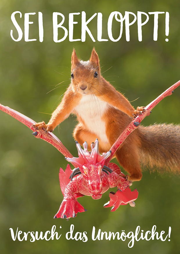 Das fröhliche Eichhörnchen sitzt auf einem roten Drachen und zeigt sich mutig in einem Garten. Die Szene strahlt Lebensfreude und Abenteuerlust aus.