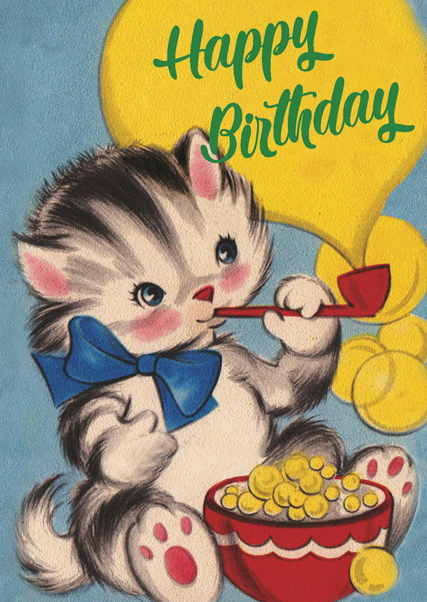 Ein fröhliches Kätzchen mit einer blauen Schleife sitzt vor einer Schüssel mit Süßigkeiten und feiert seinen Geburtstag mit buntem Konfetti und einer „Happy Birthday“-Botschaft.
