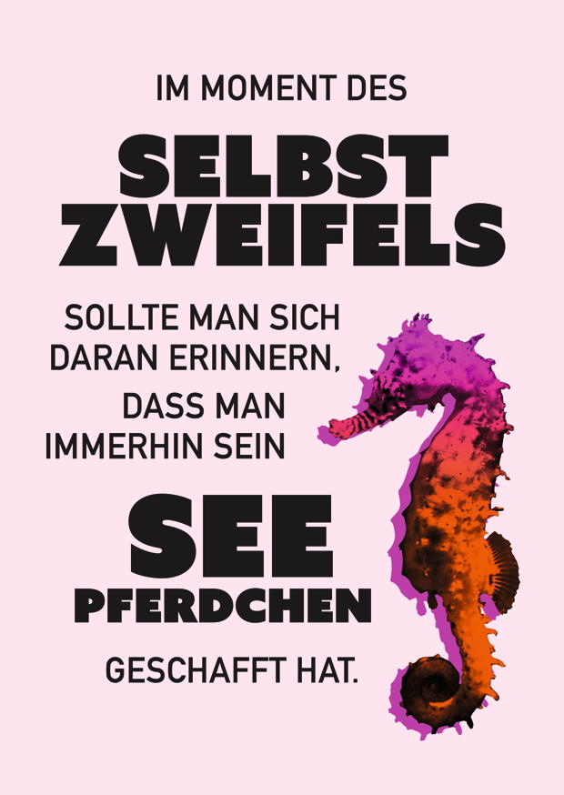 Das Zitat erinnert daran, in Momenten des Selbstzweifels die eigenen Erfolge zu schätzen. Ein Seepferdchen symbolisiert das Besondere an jedem Menschen, platziert auf einem pinken Hintergrund.