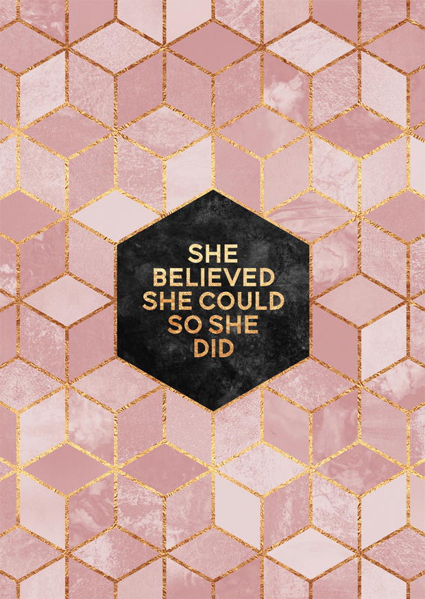 Das Motiv zeigt ein kraftvolles Zitat in einem sechseckigen Rahmen auf einem ansprechenden, geometrischen Hintergrund in Rosa und Gold. Ideal für dekorative Zwecke.