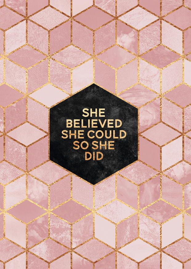Ein ansprechendes Zitat mit dem Text „She believed she could, so she did“ auf einem stilvollen Hintergrund aus rosa und goldenen Hexagonen, das zum Nachdenken anregt.