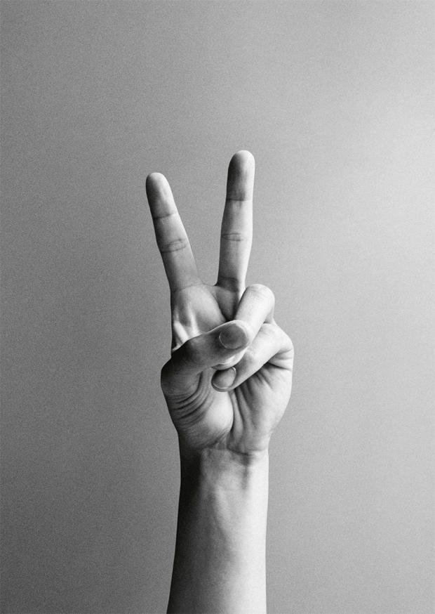 Eine menschliche Hand zeigt das Peace-Zeichen. Die Finger sind markant in einem minimalistischen Schwarz-Weiß-Setting angeordnet, was eine friedliche Botschaft vermittelt.
