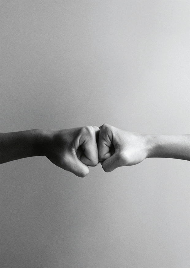 Zwei Hände führen einen Fistbump aus, um Freundschaft und Verbundenheit auszudrücken. Der neutrale graue Hintergrund ermöglicht den Fokus auf die Hände.