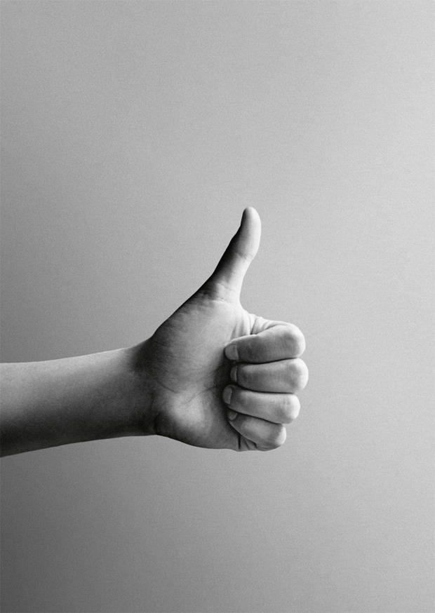 Die Hand zeigt einen Daumen nach oben, was Zustimmung oder positives Feedback symbolisiert. Der Hintergrund ist schlicht und einfarbig, wodurch die Geste betont wird.