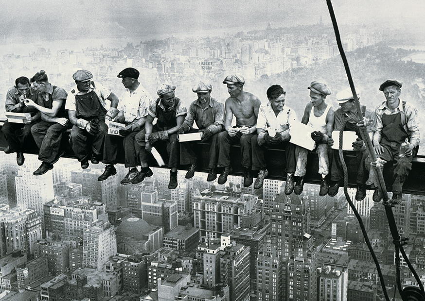 Eine Gruppe von Bauarbeitern sitzt auf einem Stahlträger hoch über New York City. Sie essen, entspannen sich und genießen die Aussicht während der Arbeit am Wolkenkratzer.