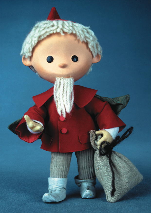 Der kleine Sandmann mit rotem Mantel und neugierigem Blick steht bereit, um Geschenke zu verteilen. Seine Enthusiasmus ist für die bevorstehenden Feiertage deutlich spürbar.
