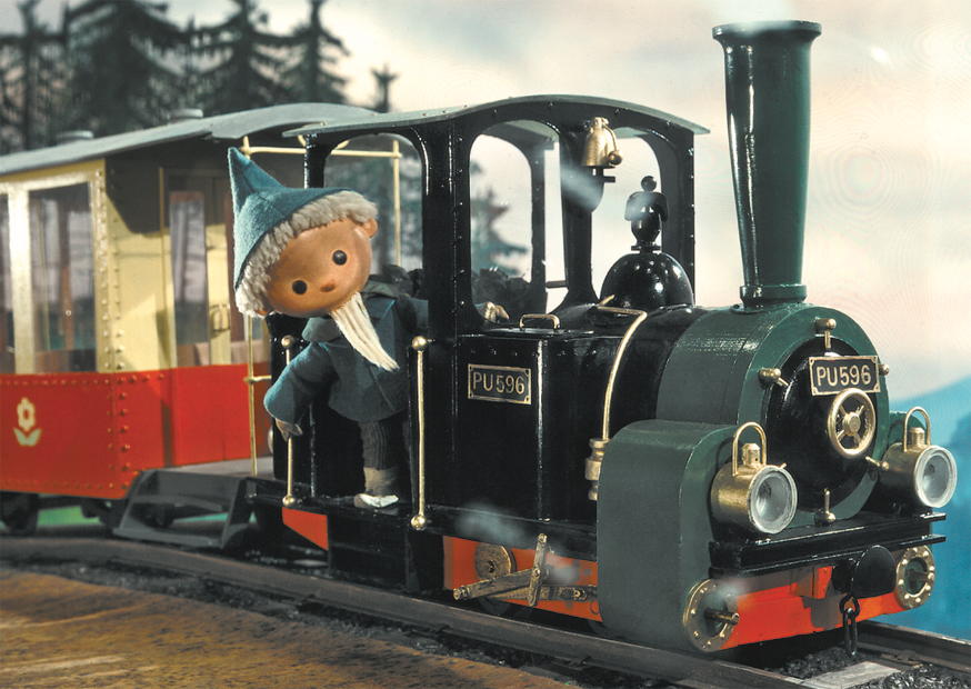 Die Dampflok mit dem lebendig wirkenden Sandmann fährt auf einem kleinen Modellbahn-Gleis durch eine malerische Landschaft und vermittelt ein Gefühl von Kindheitserinnerungen.