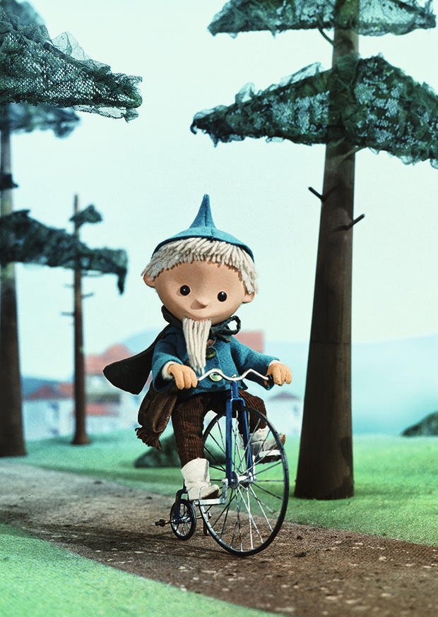 Der bezaubernder Sandmann auf einem Fahrrad radelt fröhlich durch eine grüne Landschaft mit hohen Tannen und sanften Hügeln an einem ruhigen Morgen.
