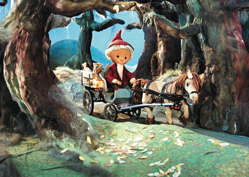 Der Sandmann mit roter Cape lenkt eine Pferdekutsche durch einen malerischen Wald mit bunten Blättern im Herbst.