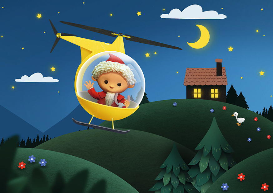 Der Sandmann in einem roten Kostüm fliegt mit einem gelben Hubschrauber über die sanften Hügel. Im Hintergrund leuchtet ein Haus unter dem Sternenhimmel.
