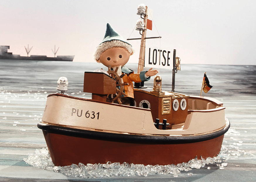 Der Sandmann in traditioneller Kleidung steuert sein Boot, während er dem ankommenden Schiff auf ruhiger See zuruft. Die Szenerie ist maritim und einladend.