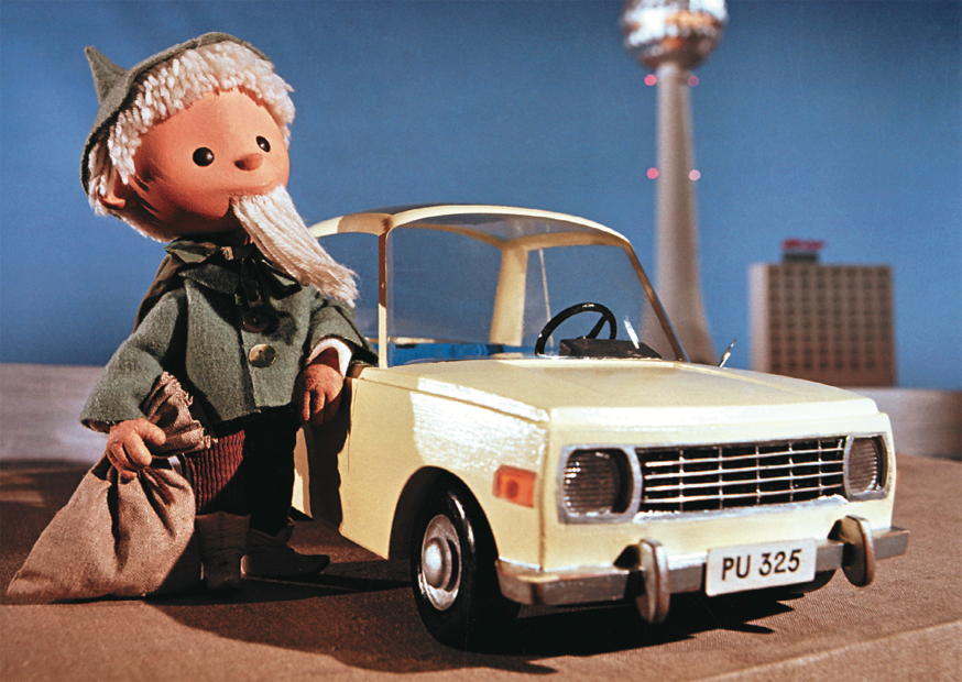 Ein freundlicher, bärtiger Sandmann trägt einen grünen Hut und hält einen Sack. Er steht neben einem gelben Auto vor einer Stadtkulisse der 1970er Jahre.