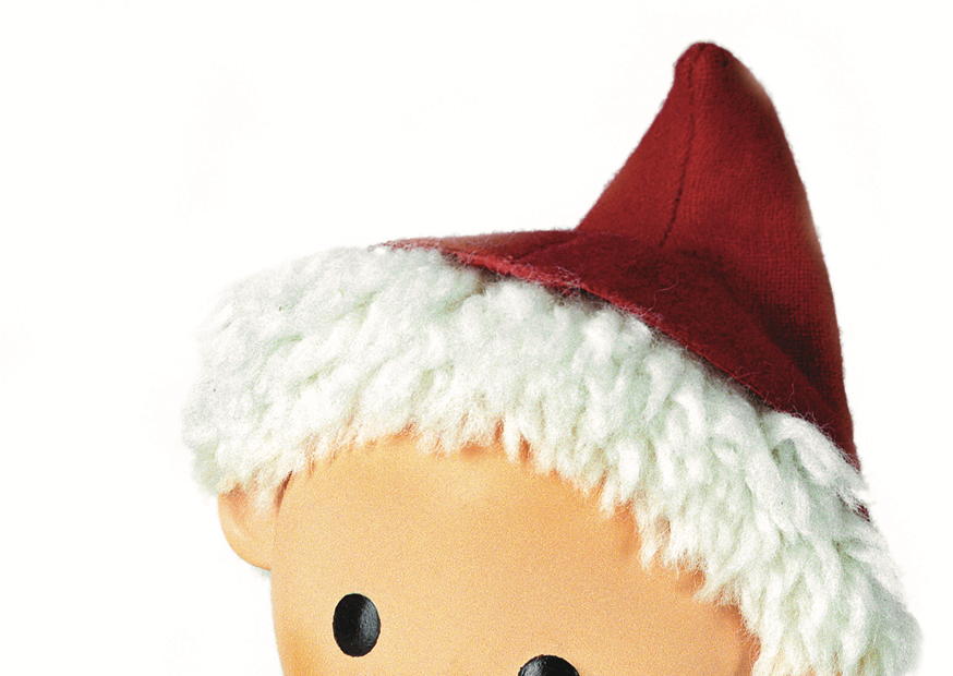 Der Sandmann trägt einen roten Hut und hat eine weiche, weiße Mütze. Seine runden Augen strahlen fröhlich und laden zum Fest ein.