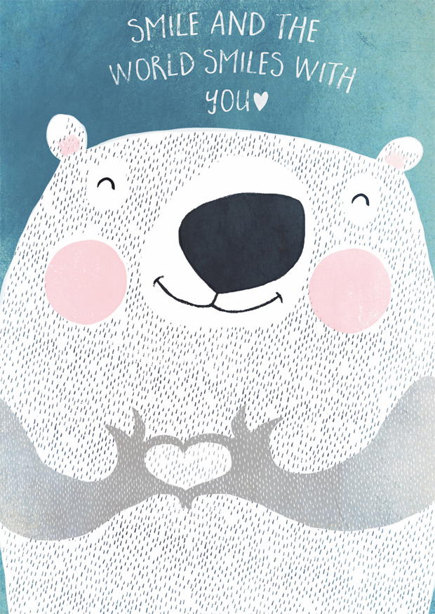 Ein lächelnder Bär mit einem herzlichen Ausdruck wird von einem hellen, blauen Hintergrund begleitet. Er symbolisiert Freude und positive Energie.