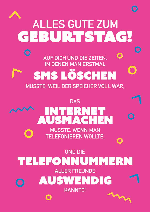 Der bunte Geburtstagsgruß reflektiert auf humorvolle Weise die technischen Hürden der vergangenen Zeiten, die man überwinden musste, um in Kontakt zu bleiben.