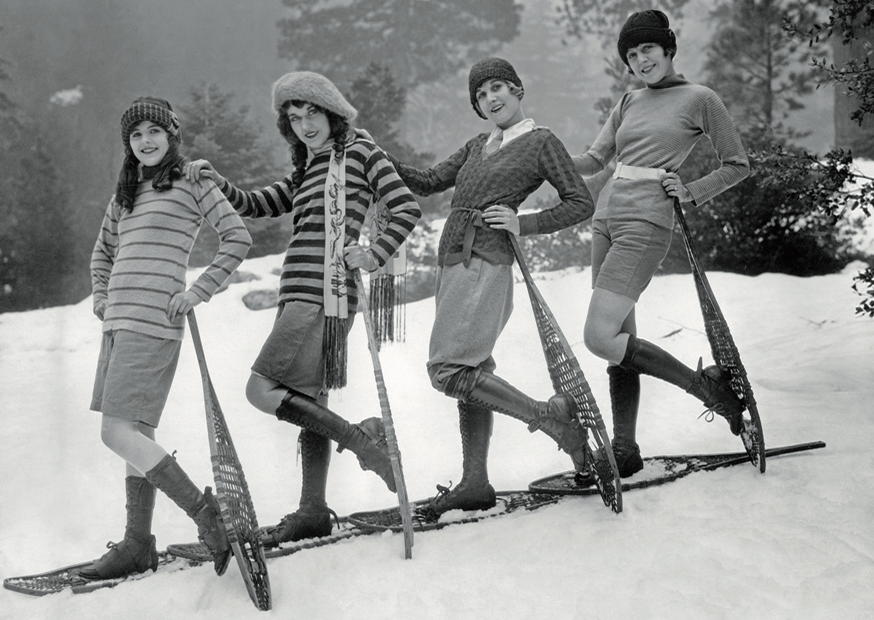 Die vier Frauen zeigen sich in nostalgischer Skibekleidung, während sie auf Schneeschuhen in einer schneebedeckten Landschaft posieren und Freude am Wintersport haben.