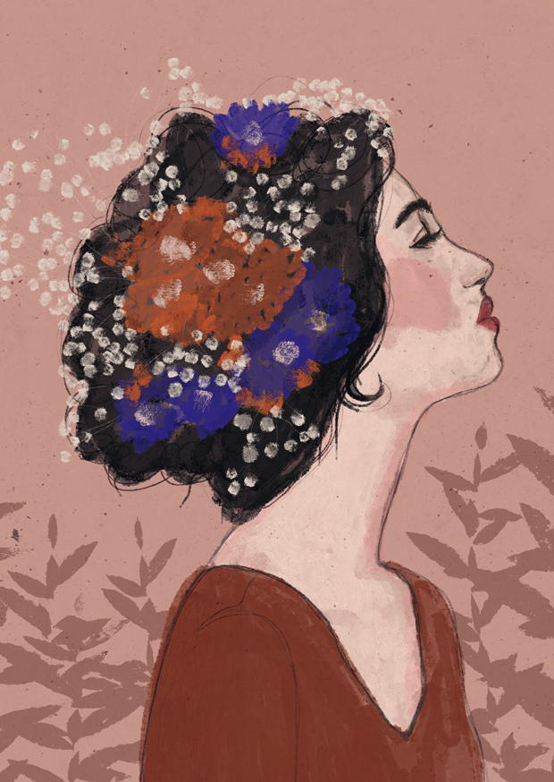 Eine Frau mit dunklen Haaren und einem bunten Blumenhaarkranz betrachtet nachdenklich die Umgebung. Der rosa Hintergrund verleiht dem Bild eine ruhige Atmosphäre.