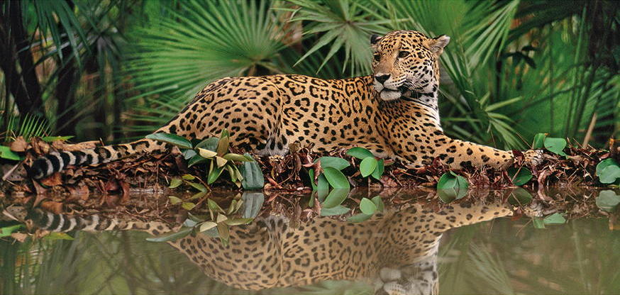 Der Jaguar liegt entspannt am Ufer eines stillen Wassers, umgeben von üppigem Grün und reflektiert im Wasser. Die Schönheit der Natur präsentiert sich in voller Pracht.