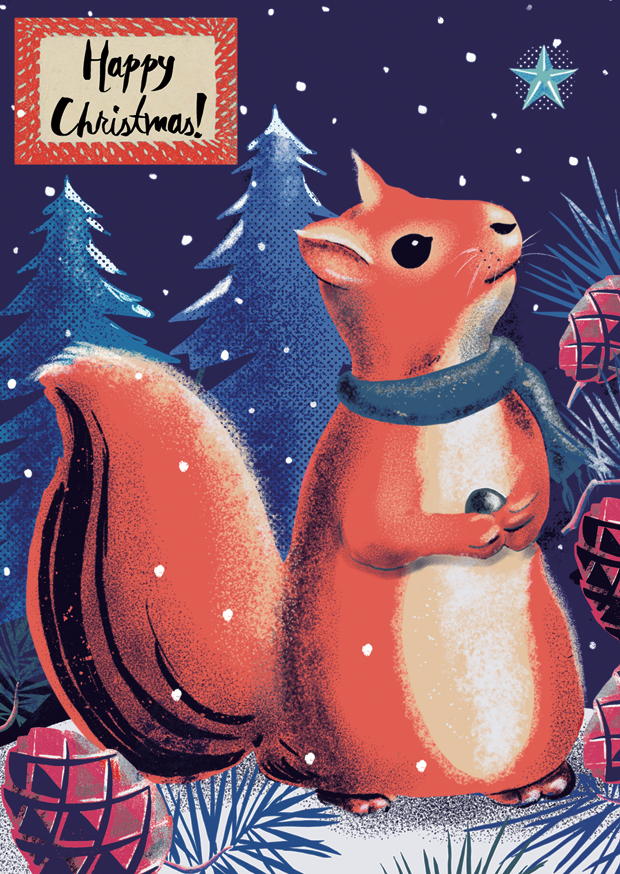Ein niedliches Eichhörnchen mit einem blauen Schal steht vor einer winterlichen Kulisse, umgeben von Tannenbäumen und Weihnachtsdekoration, und hält eine Glaskugel in der Hand.
