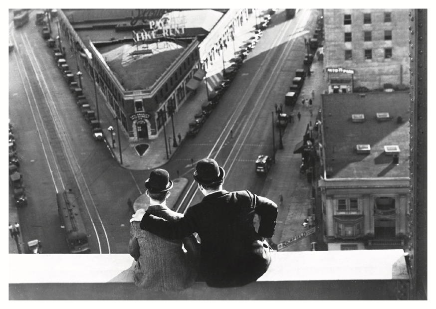 Zwei stilvoll gekleidete Männer sitzen am Rand eines Hochhauses und beobachten die belebten Straßen unter ihnen in San Francisco. Es ist ein sonniger Tag in den 1930er Jahren.
