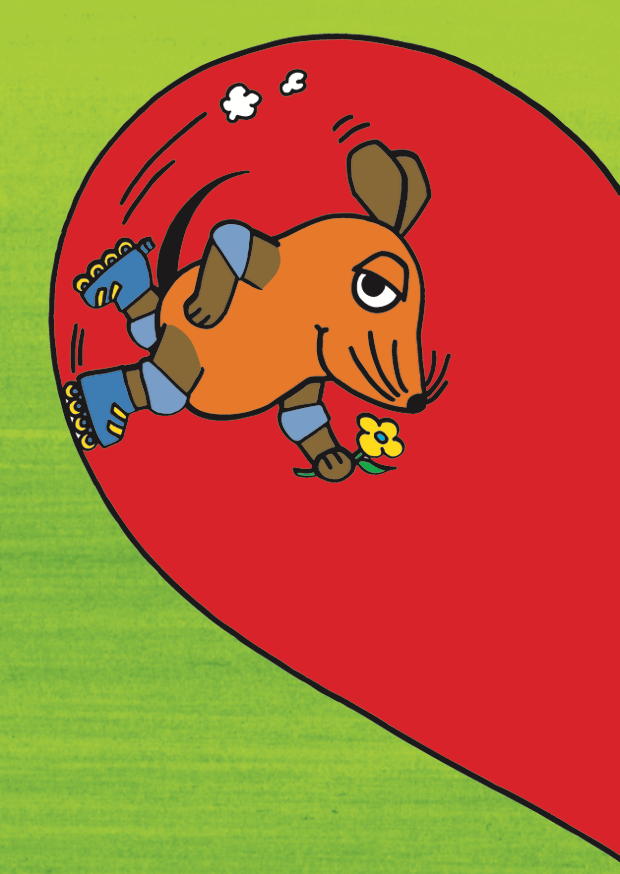 Eine Maus in leuchtenden Farben fährt auf Rollschuhen. Sie hält eine Blume in der Hand und bewegt sich schnell auf einem klaren, grünen Hintergrund mit einem roten Herz.