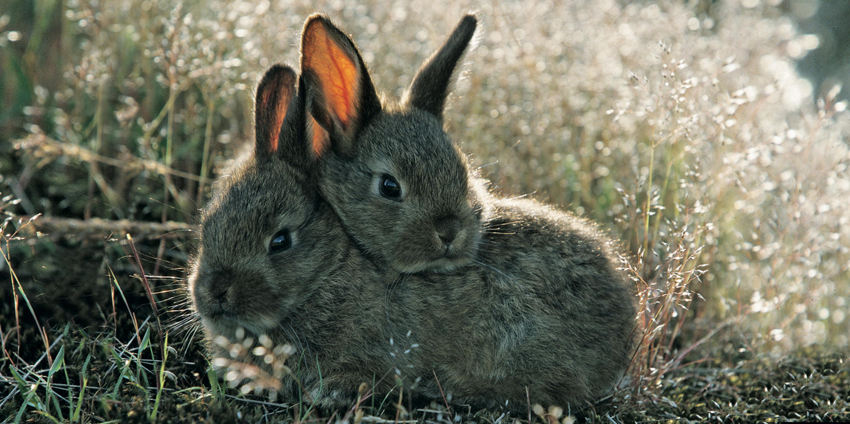 Zwei kleine, flauschige Kaninchen liegen eng beieinander in der Wiese, umgeben von sanften Gräsern und im warmen Licht eines sonnigen Nachmittags.
