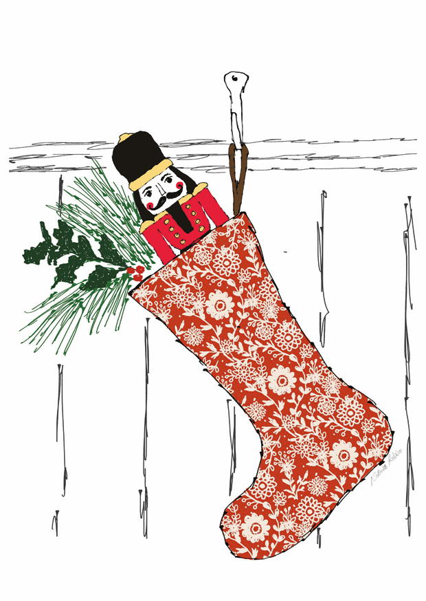 Der Nussknacker sitzt gemütlich in einem roten Weihnachtssocke, umgeben von grünen Tannenzweigen. Alles ist festlich und für die Winterzeit dekoriert, was eine warme Atmosphäre schafft.