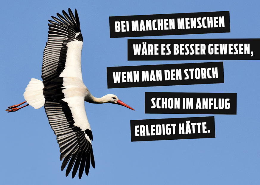 Ein Storch fliegt hoch am Himmel, während ein nachdenklicher Spruch über das Leben und Entscheidungen von Menschen in der Nähe platziert ist. Der Himmel strahlt in einem klaren Blau.