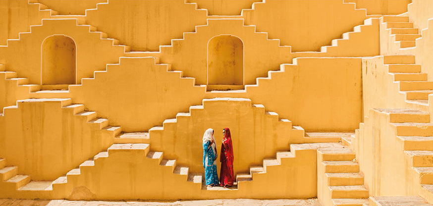 Zwei Frauen in blauen und roten Kleidern stehen an einem atemberaubenden Schrittbrunnen in Rajasthan, umgeben von sonnengelben Wänden und architektonischen Details.