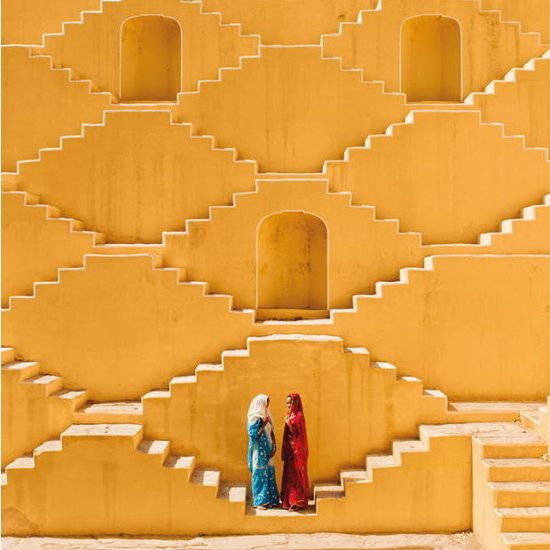 Zwei Frauen unterhalten sich freundlich vor dem gelben Schrittbrunnen in Jaipur. Die architektonische Schönheit und die kulturelle Bedeutung ziehen die Blicke auf sich.