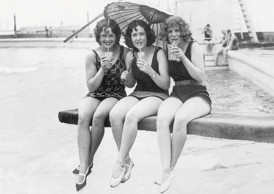 Am Rand eines Schwimmbeckens sitzen drei Frauen in Bademode und halten fruchtige Cocktails in den Händen. Sie haben einen Sonnenschirm aufgespannt, um sich abzukühlen.