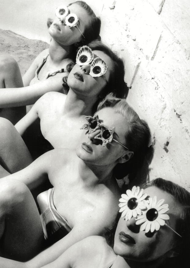 Vier Damen entspannen am Strand in den 1950er Jahren, tragen ausgefallene Sonnenbrillen mit floralen Designs und genießen die Sonne.