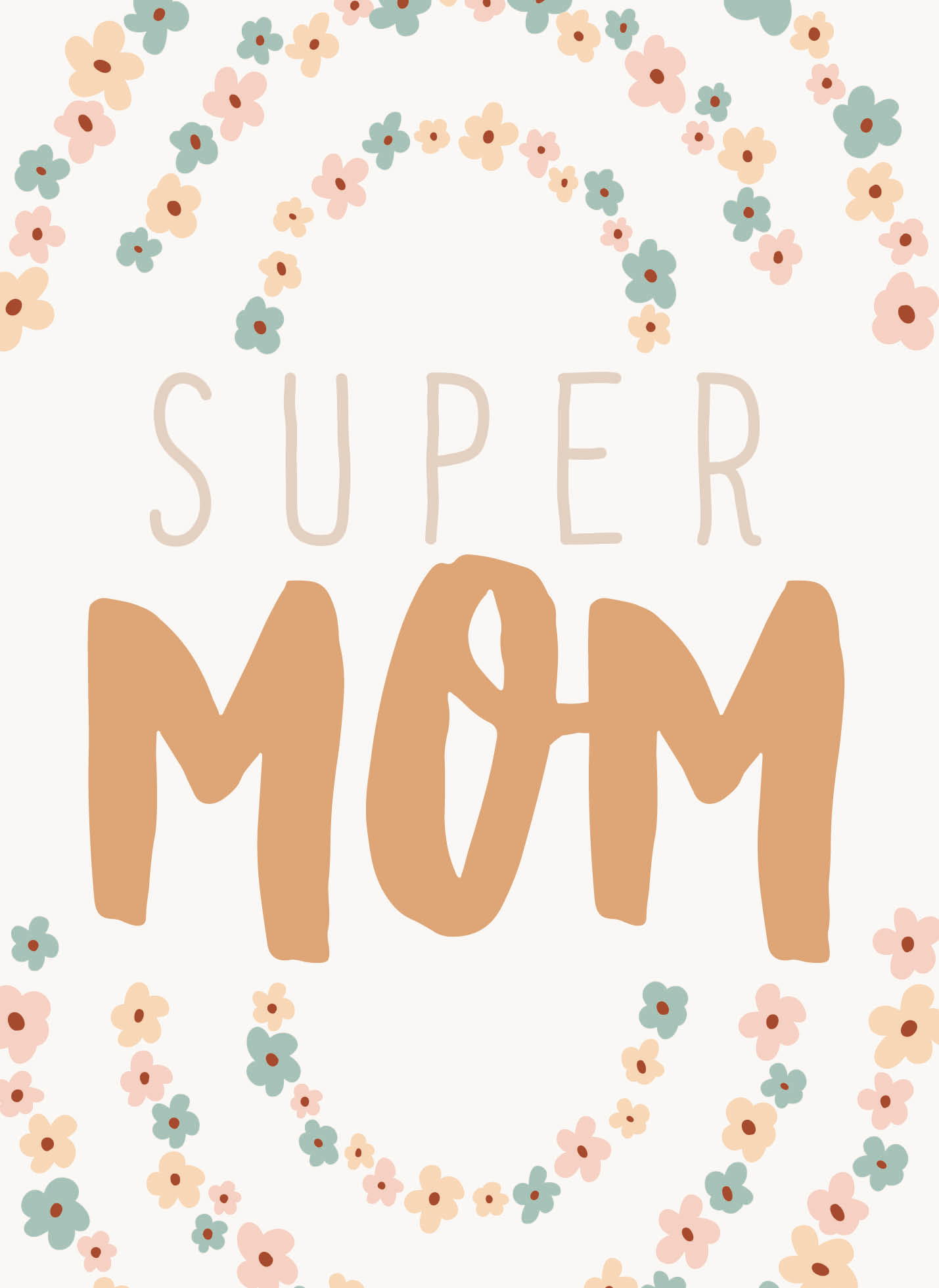 Diese kreative Gestaltung zeigt den liebevollen Ausdruck für Mütter mit dem Schriftzug Super Mom und sanften Blumenmustern. Ideal zum Verschenken an den Muttertag.