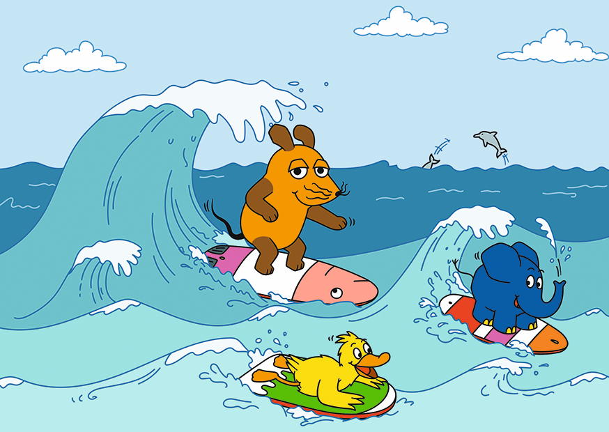 Eine Maus, ein Elefant und eine Ente surfen gemeinsam auf ihren Brettern über hohe Wellen unter einem klaren Himmel, während einige Delfine im Hintergrund schwimmen.
