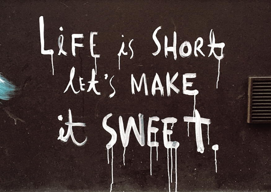 Ein kreatives Wandgemälde in einer urbanen Umgebung vermittelt eine Botschaft über das Leben. Es ermutigt dazu, das Leben süß und bedeutungsvoll zu gestalten.